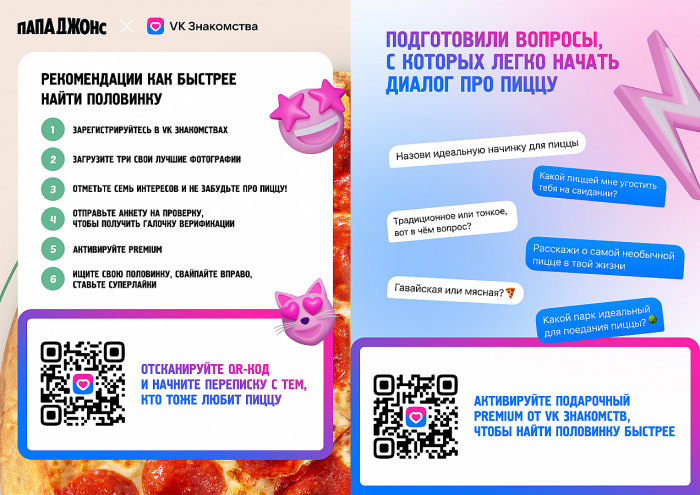 Этим летом «Папа Джонс» и «VK Знакомства» показали, что любовь к пицце может стать поводом для знакомства. В рамках кампании пользователи дейтинг-сервиса создавали мэтчи, основываясь на вкусах пиццы, а клиенты сети пиццерий заказывали «Половинки» — две пиццы в одной — со скидкой и получали Premium-функции для общения онлайн.