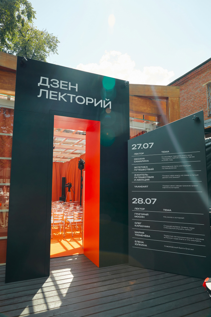 Каждый день на территории фестиваля работал «Дзен Лекторий». Известные спикеры и гости обсудили актуальные темы: путешествия, еду, моду и многое другое. В перерывах между лекциями гости отдыхали в уютной лаундж-зоне. В коллаборации с Surf Coffee® «Дзен» построили кофейню-теплицу, в которой посетители, выбирая позицию из меню и выполняя несложное задание, получали бесплатный напиток. Помимо этого, в бренд-зоне была установлена фотозона, коллаборация с фондом «Антон Тут Рядом». Гости фестиваля могли помочь детям и взрослым с аутизмом — для этого нужно было купить коробку фирменных цветных мелков от благотворительного фонда и платформы. Вырученные средства от продаж были направлены в фонд. Кроме того, нарисовав мелками звезду «Дзена» на фотозоне, сфотографировав и выложив в социальную сеть с отметками «Дзена» и фонда «Антон тут рядом», можно было принять участие в розыгрыше лимитированного мерч!