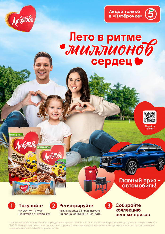 Федеральная кампания с коммуникационным сообщением «Лето в ритме миллионов сердец» предложила массовой аудитории в буквальном смысле провести это лето «с любовью»: для этого потребителям нужно было всего лишь зарегистрировать чек за покупку любой продукции «Любятово» и получить возможность выиграть множество призов от брендированных наборов путешественника до умной техники и авто для всей семьи!
