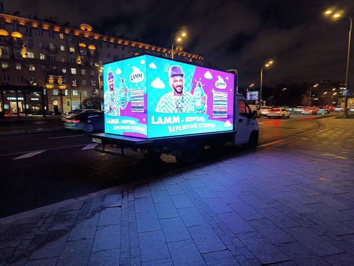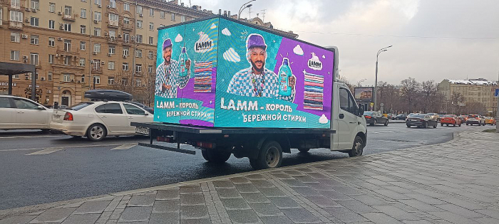 Бренд товаров для стирки Lamm запустил рекламу на диджитал-мобиле, который колесил в течение двух недель по Садовому кольцу в столице. На транспортном средстве светились яркие рекламные дисплеи с изображением Филиппа Киркорова в бирюзово-фиолетовых тонах. Бренд привлек в качестве амбассадора народного артиста. Эта активация стала частью рекламной кампании «Lamm — Король Бережной Стирки», которая продолжается до сих пор. Бренду помогла коллаборация со звездой, которая обладает яркой харизмой, обеспечивает запоминаемость и любовь аудитории — как молодой, так и зрелой. Первые результаты кампании впечатляют — знание бренда выросло на 30%, а продажи — на 41%. Реклама на диджитал-мобиле обеспечила Lamm дополнительные охваты.