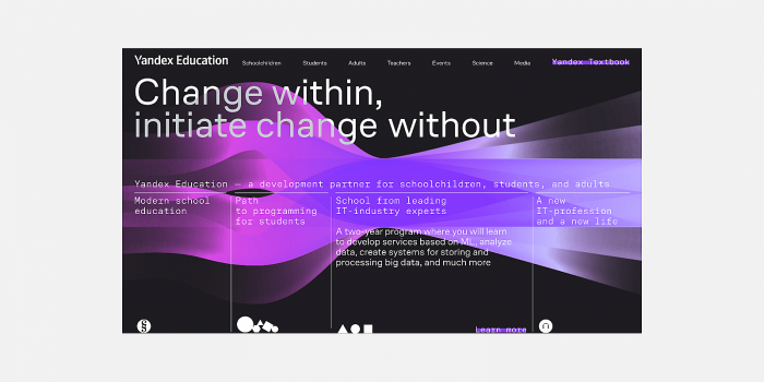 При участии выдающихся IT-специалистов «Яндекс» усиливает свои образовательные проекты прогрессивными технологиями и развивает новые форматы и качества обучения. Образовательный процесс в «Яндексе» непрерывный и спроектирован решать задачи реального мира и настоящего времени. Преданность и внимание, с которыми ему посвящены в компании — основа этой бренд-системы.