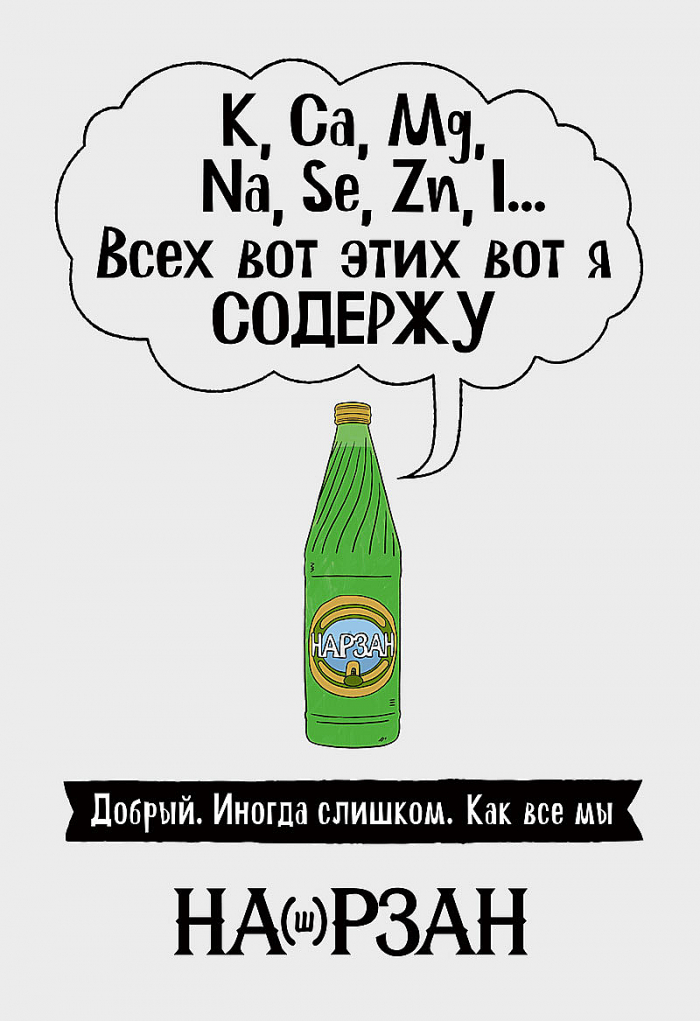 «Холдинг Аква» и группа компаний «Родная Речь» решили изменить советский образ бренда минеральной воды «Нарзана» и запустили новую кампанию. Задача стояла нетривиальная: «отряхнуть пыль» с бренда и превратить его в современный и созвучный потребностям людей в их сегодняшней жизни. Креаторы хотели напомнить, что «Нарзан» обладает множеством ценных качеств и преимуществ, «главным из которых является то, что он наш». Подробнее на Sostav.
