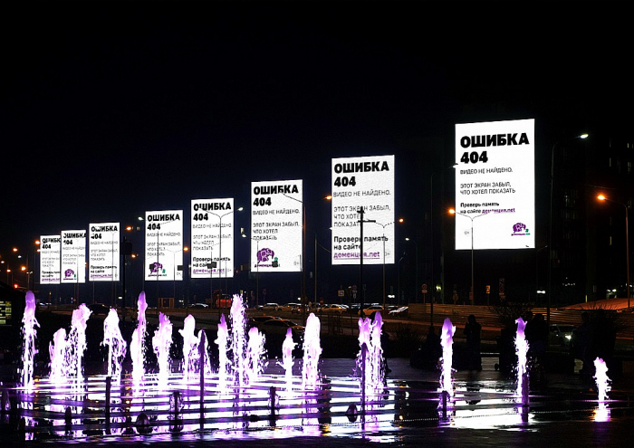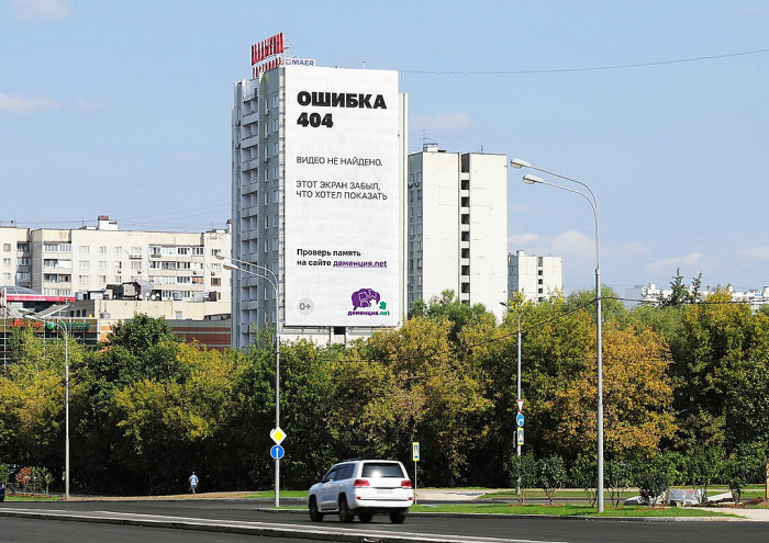 В России стартовала кампания «Ошибка 404», созданная в рамках проекта Деменция.net, чтобы привлечь внимание к профилактике и ранней диагностике деменции. Символом кампании стали баннеры, «забывающие» свою информацию, отражая суть когнитивных нарушений. Креативную концепцию разработал режиссёр Александр Сёмин совместно с агентством What If Semin?. Идею поддержали операторы наружной рекламы, предоставив более 150 поверхностей в 15 регионах. Кампания приурочена к Всемирному месяцу борьбы с болезнью Альцгеймера. Подробнее на Sostav.