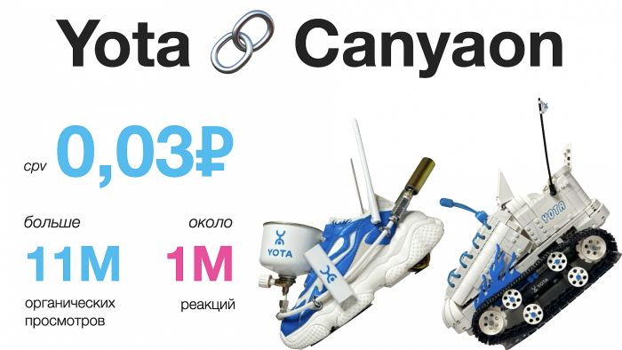Когда Yota переключилась на аудиторию Gen Z, бренд решил поддерживать молодых креаторов, вовлекать их в коммуникацию и создавать с ними настоящие коллаборации, а еще — говорить на одном языке с зумерами. Так, Yota сделала две смелых коллаборации с апсайкл-дизайнером Canyaon. В первую коллаборацию — Yota Fire Shoes. Speed Router, реактивные кроссовки с газовыми горелками, — интегрировали смысл скорости связи от Yota, которая позволяет быстро серфить в интернете необходимую информацию и мгновенно обмениваться сообщениями в мессенджерах с друзьями. Вторые арт-кроссовки — Yota Off-Road Boots — были собраны из конструктора и управлялись с помощью радиоуправления. И не просто так: это подчеркивало основного продукта Yota — тариф «Конструктор», который можно было настраивать самостоятельно. Обе коллаборации вызвали шумиху в медиапространстве. Кампания получила много вирусных упоминаний, включая крупное международное медиа о моде и трендах Hypebeast. И даже Маша Миногарова в своем шоу сделала обзор на кроссовки.