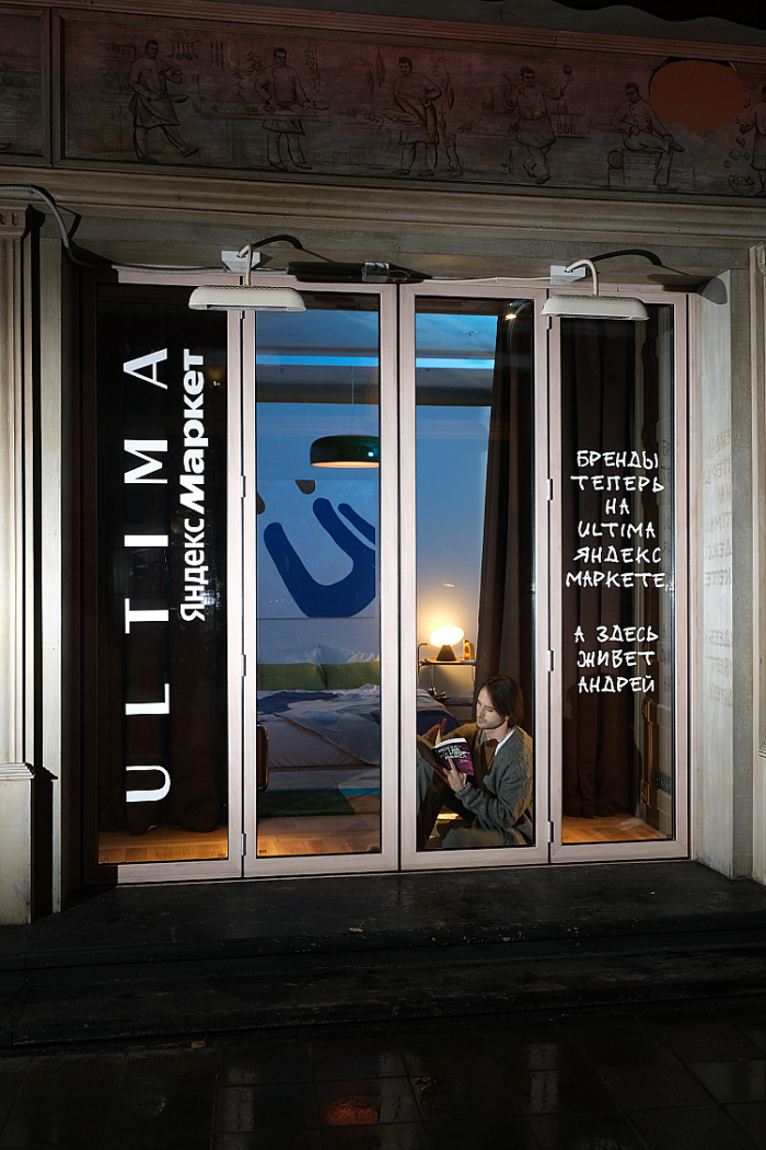 Витрина бывшего Cartier стала самым модным московским аквариумом — в девяти стеклянных кубах поселились рыбки разных цветов и размеров. Оформление выполнено в стилистике бренда Ultima — в качестве декора использовали натуральные материалы: песок, кораллы, коряги и сухоцветы. Помимо статичной подсветки и декора, использовали каустику — динамическую подсветку — со сменой цветов от тепло-белого к лазурному. Благодаря каустике создавался эффект водного пространства. На Патриарших на время проекта «поселился» Андрей. Это простой человек, который живет своей обычной жизнью за стеклом вместе с котом. Чтобы жизнь Андрея в витрине была максимально приближена к реальному дню обычного человека, BALAGAN придумал занятия для героя. За время проекта интерьер «дома» Андрея менялся три раза. Герой витрин проводил время в спальне, кабинете и гостиной. Для каждого сетапа мы разработали уникальный дизайн — подобрали мебель, оформление, детали интерьера, свет.