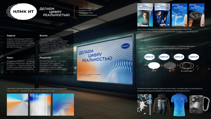 НЛМК ИТ и Braining Group разработали позиционирование: «IT не ради IT». Это не только про технологии, но и про осязаемые решения, которые реально трансформируют производство и всю индустрию. Эти идеи нашли отражение в генеральном слогане: «Делаем цифру реальностью», а набор саблайнов усилил контраст между настоящими достижениями и тем, что делается в IT ради хайпа и моды. В основе адаптации бренда для НЛМК ИТ — доработанные текстуры настоящей стали, которые «подсвечиваются» с градиентами, взятыми из материнского бренда. Все это идеально подчеркивает идею «реального ИТ».