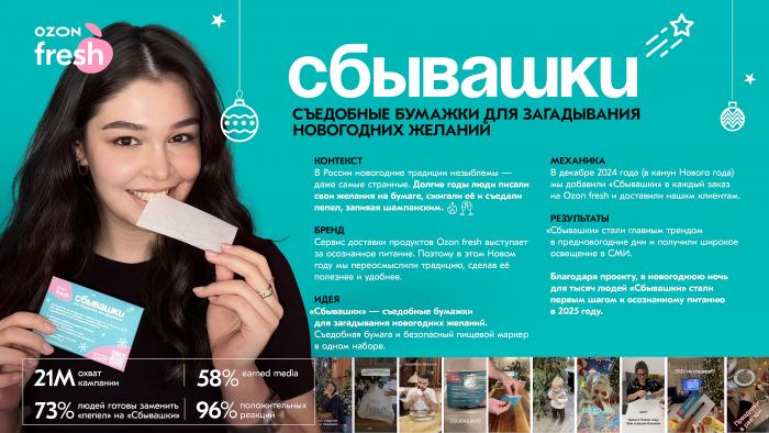 Съедобная бумага и безопасный пищевой маркер в одном наборе. В декабре 2024 года (в канун Нового года) мы добавили «Сбывашки» в каждый заказ на Ozon fresh и доставили нашим клиентам. «Сбывашки» стали главным трендом в предновогодние дни и получили широкое освещение в СМИ. Подробнее на Sostav.