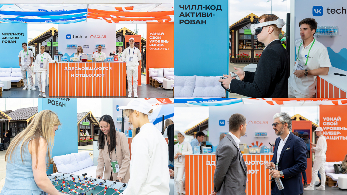 ГК «Солар» и VK Tech приняли участие в ЦИПР 25, а мы разработали для них притягательные бренд-зоны. Уличная зона В лаунже VK Tech и ГК «Солар» гости могли бесплатно зарядить устройства, сыграть в настольный футбол, VR и т.д. За прохождение интерактивов они получали фишки, которые обменивали на напитки. Фишкой был киберчекап «Узнай свой уровень киберзащиты». Корпоративные клиенты запускали диагностику своей компании, а частные проверяли себя на киберграмотность. Концепция — «Цифровой архитектор». Стенд оформлен в стиле кибервселенной: с динамичной подсветкой, экранами, интерактивными элементами. Так показали, как компания проектирует цифровую реальность, сочетая инновации и безопасность. Мы разработали мерч и интерактивы, напр., пройти 10 световых лет за 100 секунд. Пока гость шел по дорожке, на экране появлялась информация о пути компании до архитектора комплексной кибербезопасности, а темп увеличивался. Результаты: за 6 дней с зонами познакомились 17 462 гостя.