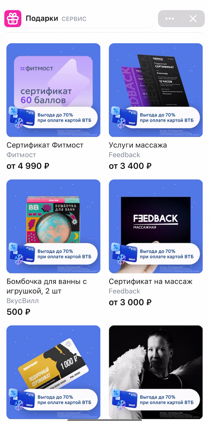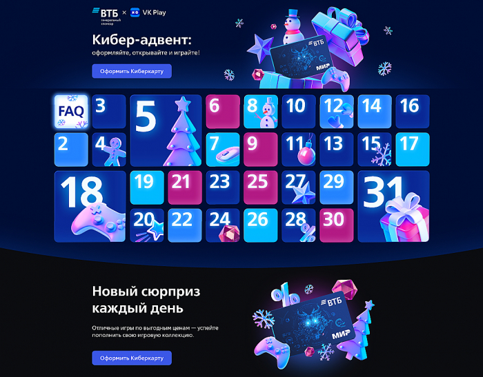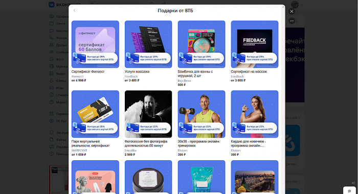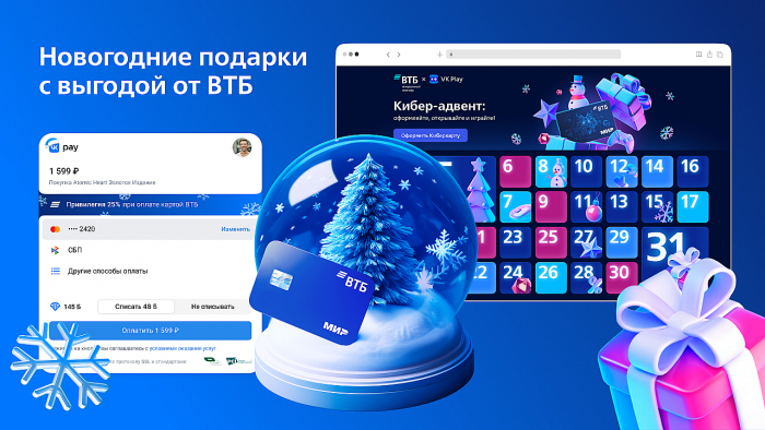 ВТБ реализовал масштабный и инновационный проект на платформе VK, который не только успешно достиг всех поставленных целей, но и сделал предновогодние покупки пользователей невероятно приятными и выгодными. Эксклюзивно для ВТБ команда VK разработала уникальное решение — интеграцию в универсальную платежную систему VK Pay – это абсолютно новый формат для банков, открывающий новые горизонты цифрового платежа. Благодаря данной интеграции пользователи смогли приобретать голоса ВКонтакте, подписку на «VK Музыку», игры в VK Play и подарки «ВКонтакте» с выгодой до 70% при оплате картой ВТБ. В преддверии Нового года миллионы пользователей не только узнали о преимуществах банковских карт ВТБ, но и получили бесшовный клиентский опыт при покупке подарков себе и своим близким.
