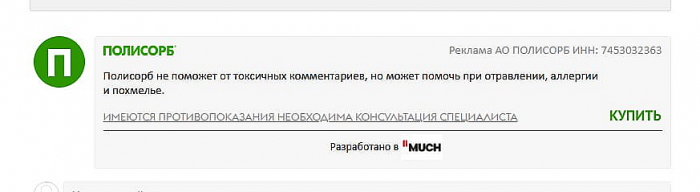 TooMuch разработали новый рекламный инструмент для «Полисорб» на Sostav, с помощью которого получилось разместить баннер, неуязвимый для блокировщиков рекламы. Всем известны комментаторы на Sostav своей токсичностью, поэтому была придумана креативная идея «"Полисорб" не поможет от токсичных комментариев». Креатив размещался закрепленным текстовым комментарием в каждом из новостных постов на сайте, что позволило демонстрировать его даже с работающим блокировщиком, так как реклама не являлась блокируемым изображением, но визуально воспринималась как баннер. Общее количество просмотров за время публикации составило более 1,5 млн., также были упоминания о рекламе в телеграм каналах посвященных маркетингу. Подробнее на Sostav.