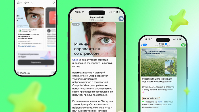 «Сбер» и агентство makelove разработали AI-тренажер для собеседований, который считывает волнение во время тестового интервью и даёт рекомендации, как избежать стресса. Студенты волнуются во время интервью. Каждый второй выпускник переживает из-за сложных вопросов по специальности. Треть молодых людей боятся, что не смогут достаточно хорошо себя презентовать. Мы поддержали студентов и разработали Al-тренажер, который помогает превратить нервное интервью в приятный опыт. Обучали модель на реальных собеседованиях. Тренажер при помощи технологии computer vision распознает изменение мимики, эмоций, реакций и составляет временной ряд с эпизодами тревоги. А после говорит, на каких вопросах было зафиксировано волнение, и дает рекомендации от психологов и эйчаров о том, как снизить стресс в этих случаях. Результаты Охват проекта — 4 200 000 человек. 104 127 пользователей посетили сайт с тренажером.