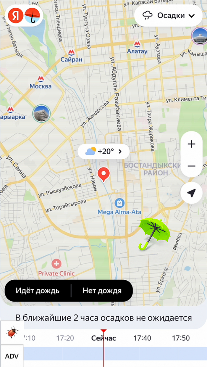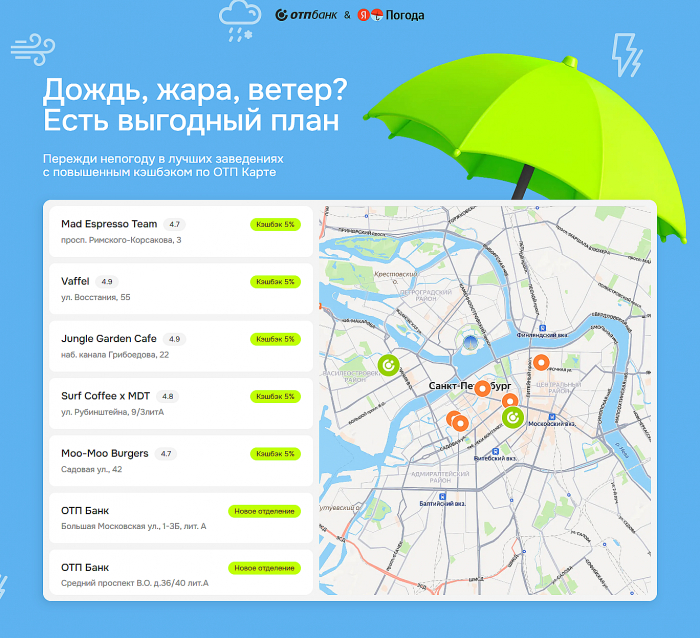 Период: 16 июня по 29 июня 2025 года (2 недели) Цели и задачи: Вовлечь аудиторию нестандартным подходом, рассказать об оффлайн-мероприятии и увеличить запросы на дебетовые карты Проект «ОТП Банка» и «Яндекс.Погоды» прошел летом этого года в самые дождливые дни в Санкт-Петербурге. На карте осадков «Яндекс.Погоды» появился лаймовый зонтик, при клике на который можно было узнать, где получить бесплатный зонт и в каких кафе можно не только переждать ливень, но и получить повышенный кешбэк банка за заказ. «Погодозависимая» реклама стартовала у Гостиного двора, где всем прохожим, раздавали лаймовые зонты. Идея акции проста: «"ОТП Банк" рядом — даже когда капает с неба».