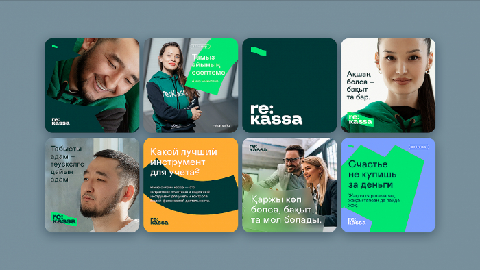 Казахстанский цифровой сервис для предпринимателей «Re:Kassa» – альтернатива традиционной кассовой технике. Параллельно с внедрением новой бизнес-стратегии, направленной на диджитализацию предпринимательской деятельности и расширение спектра услуг компании, «Re:Kassa» решила провести ребрендинг. В рамках него был создан новый логотип бренда, одновременно напоминающий чековую ленту, стикер и зеленый флажок. Так получился своеобразный знак помощи молодым предпринимателям, знак одобрения их бизнес-начинаний. Айдентика продолжила идею логотипа, усложнила начертание и смысловую нагрузку графики. Добавила утилитарную функцию изгибам ленты, превратив их одновременно и в декоративный элемент, и в контейнер для бренд-контента. Палитра фирменных цветов подчеркнула связь сервиса с материнским брендом Freedom.
