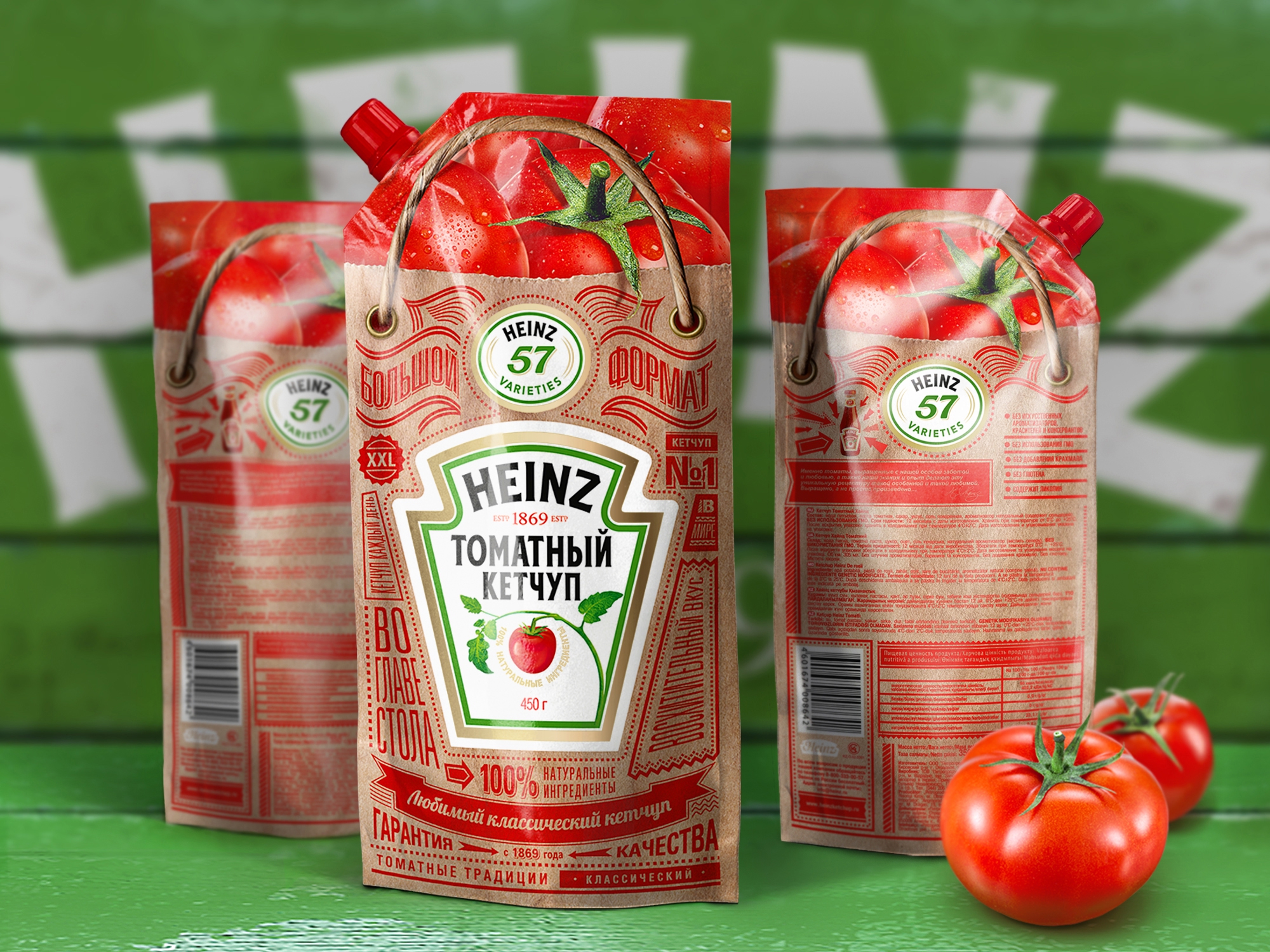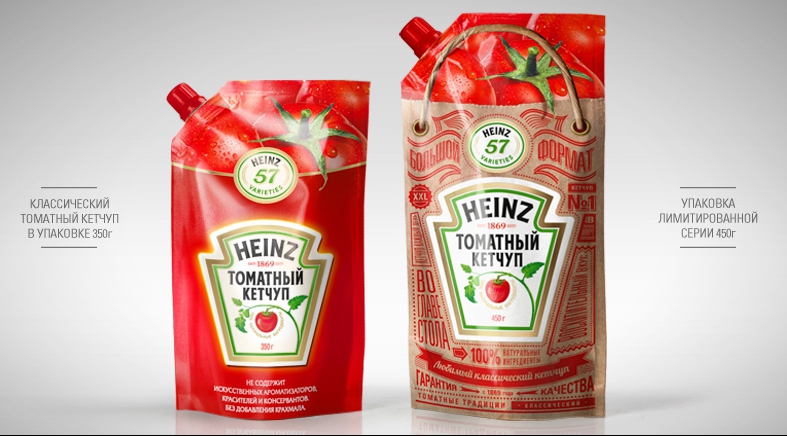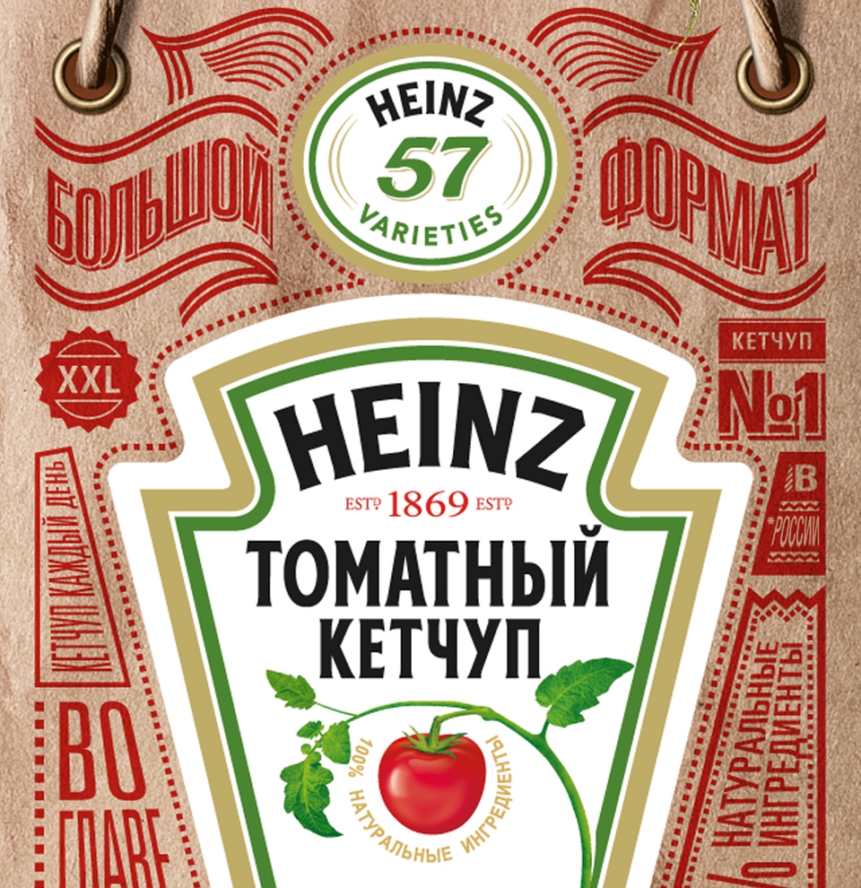 Агентство Depot WPF в 2013 году разработало дизайн праздничной серии кетчупов Heinz - одного из крупнейших производителей кетчупов, соусов и майонезов в мире. Креаторы сделали акцент на натуральности и особом бережном отношении к кетчупу Heinz. Крафтовая бумага идеально подошла для того, чтобы передать эти качества визуально. А викторианская типографика отразила в дизайне «heritage».
