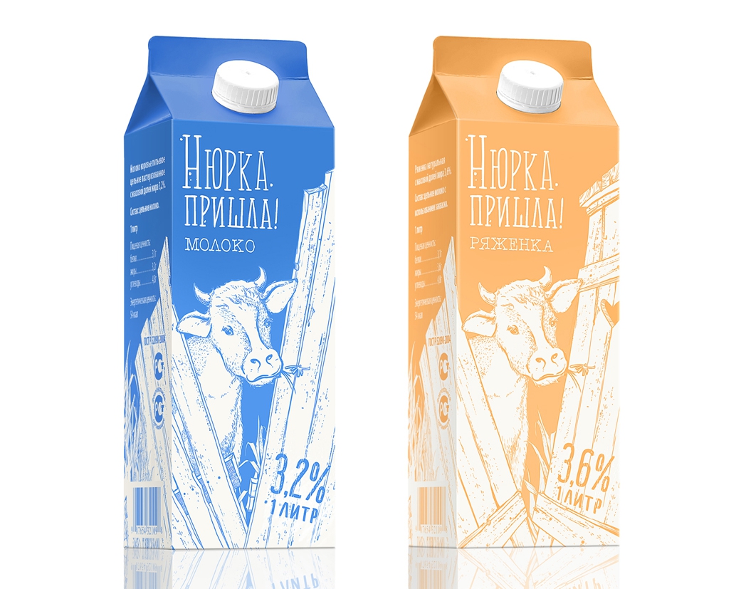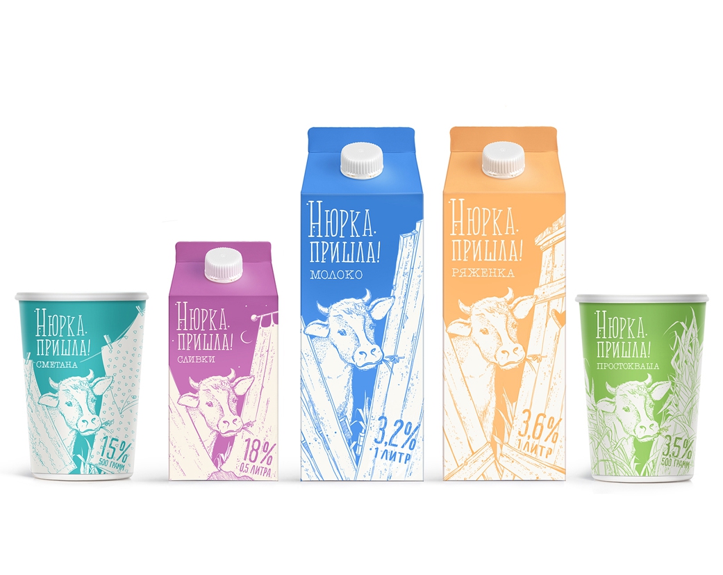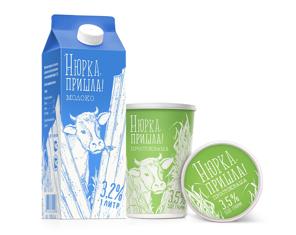 Fгентство Viewpoint в 2013 году разработало название и дизайн для линейки натуральных молочных продуктов ОАО «Молвекпром» - «Нюрка пришла!». Центральным персонажем бренд-платформы стала корова Нюрка, которая неожиданно появляется в различных местах. Таким образом авторы хотят донести до потребителя мысль о натуральности продукта, которое нашло отражение в изображении деревни. Простые и чистые цветовые решения в два пантона делают упаковку удобной для производства и заметной для покупателя, а выбор имени буренки связан с его популярностью.
