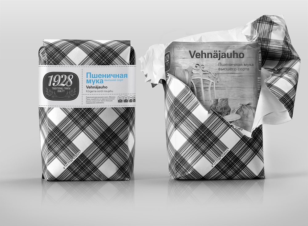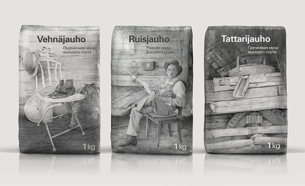 Агентство Depot WPF в 2013 году разработало дизайн упаковки для муки под брендом «1928» от финского концерна Myllyn Paras. На внутреннем бумажном пакете изображены сцены из жизни небольшой западной мукомольни первой четверти прошлого века. Стилистически мягкие, «хрупкие», тщательно отрисованные простым карандашом в классической технике иллюстрации контрастируют с жесткой современной черно-белой графикой внешней упаковки. Ее клетчатый паттерн образуется из пересечений линий штрих-кодов. При этом иллюстрации не конфликтуют: внешняя, «современная», упаковка как бы защищает внутреннюю, «традиционную».
