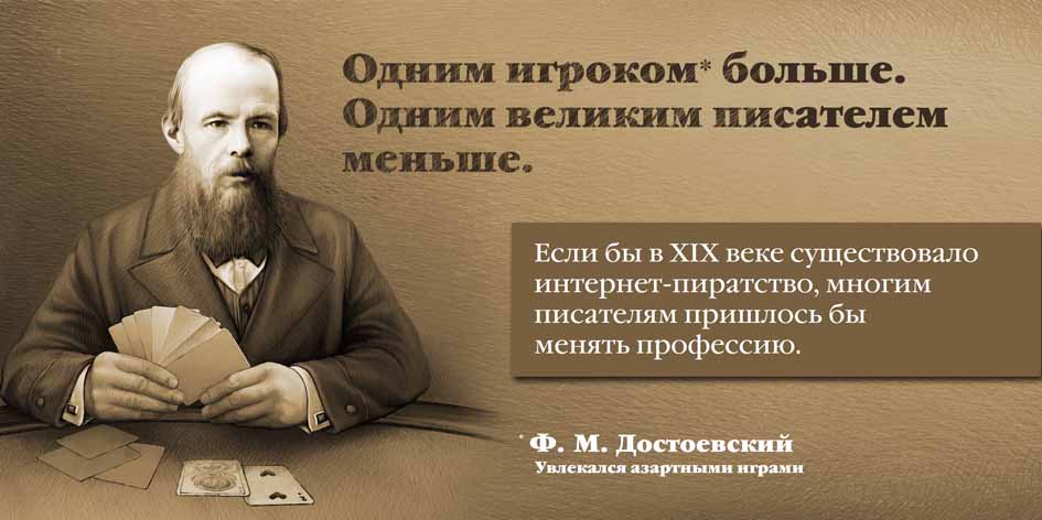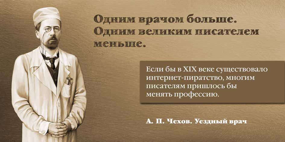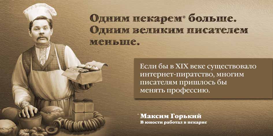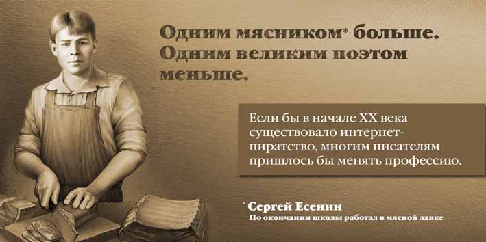 Необычную кампанию против пиратства в интернете провели в 2013 году Российский книжный союз и агентство JWT Russia при поддержке Russ Outdoor. Креаторы показали, кем бы были классики русской литературы, если бы сетевые пираты орудовали бы на рубеже XIX –XX веков. На рекламных баннерах предстают Чехов, Достоевский, Есенин и Горький в образе тех профессий, которым могли бы посвятить жизнь, если бы не стали гениями литературы. Слоган кампании соответсвующий - «Одним врачом/игроков/мясником/пекарем больше, одним великим писателем меньше».