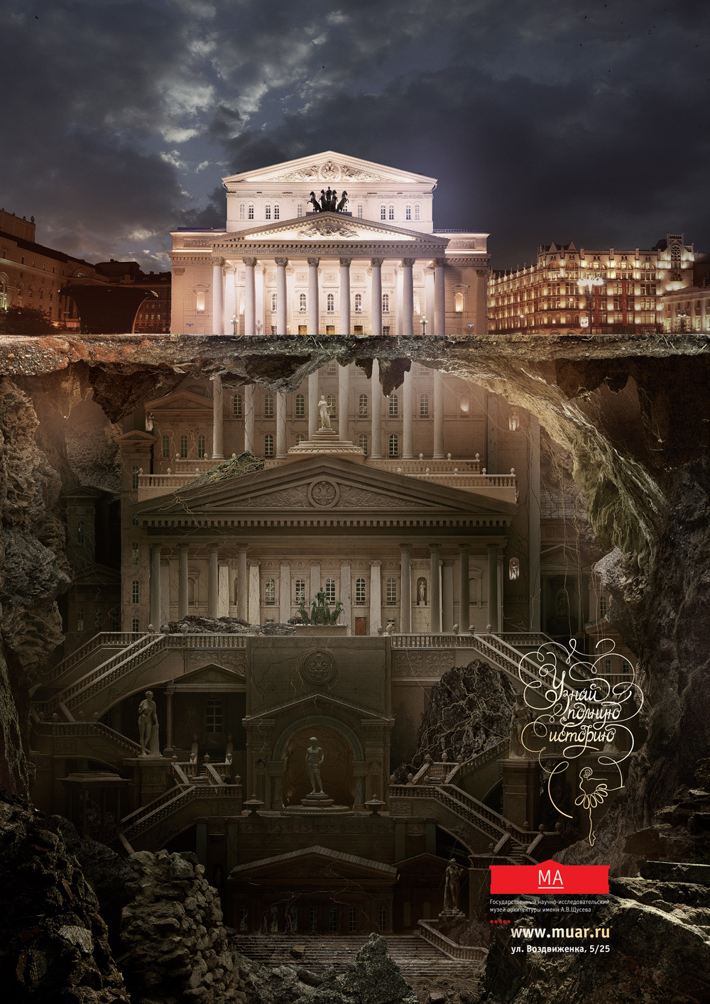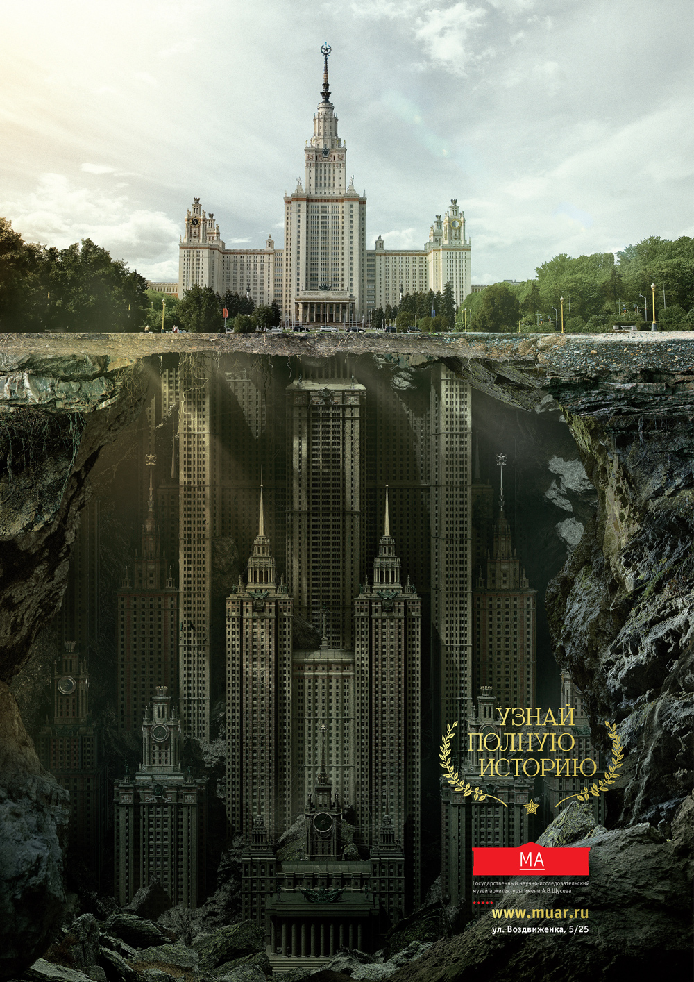 Агентство Saatchi&Saatchi Russia разработало кампанию для государственного музея архитектуры им.Щусева. На принтах изображены знаковые для Москвы объекты архитектуры, среди которых – здание Московского университета на Воробьевых горах, Собор Василия Блаженного на Красной Площади и Большой театр. Идея концепции – продемонстрировать, что строения имеют богатую историю, которую еще нужно узнать, «раскопать».