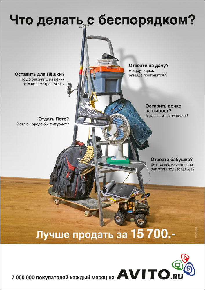 Состав творческой группы Practica Директор по стратегическому планированию: Рустам Салимзянов Production-компания Pacific Films Второй флайт вышел в эфир только через девять месяцев – в сентябре. Это были четыре ролика и столько же макетов для принтов и наружки. Новые видео были объединены другой общей идеей - отдавая ставшие ненужными автомобили, мебель, одежду, бытовую технику родным, друзьям, отвозя их на дачу, люди теряют деньги. Еще один ролик посвящен новой для AVITO товарной категории - автомобилям. Конкретную сумму, которую можно было бы получить за продажу старых вещей, как и раньше, озвучивали в каждом ролике. Как рассказывают в агентстве, за первую неделю кампании число посетителей выросло на 160 000 человек, а количество размещенных вещей - на 11%.