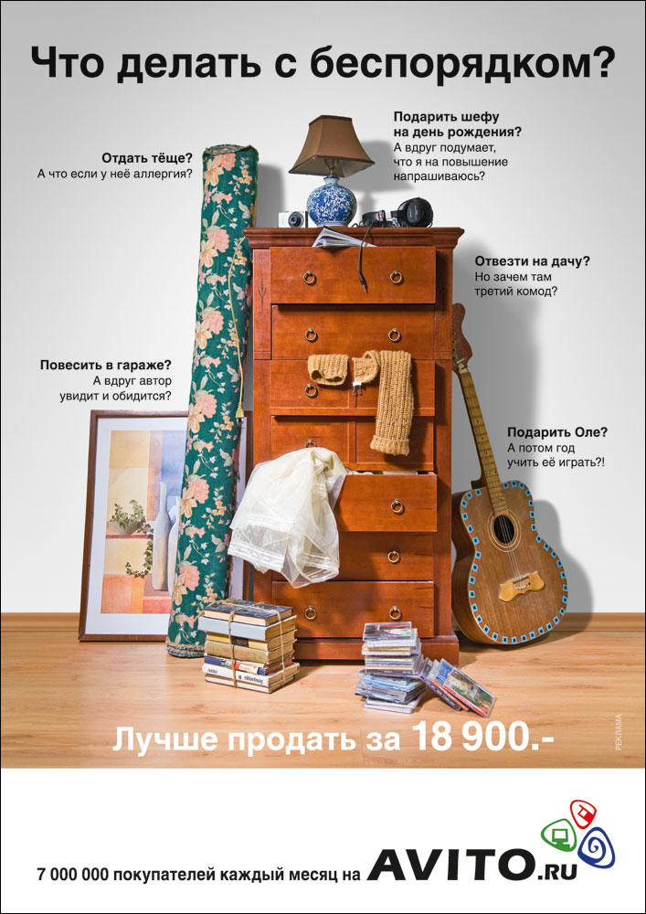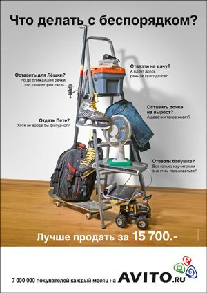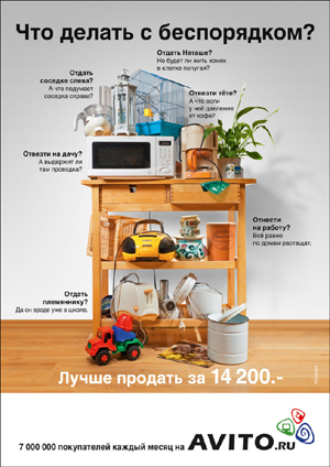 Третье место Агентство Practica сделало два флайта рекламной кампании для сервиса бесплатных объявлений Avito.ru. Оба они создавались в рамках единой креативной концепции, но всё же имели некоторые различия. Первый флайт вышел в эфир в январе 2010 года. В него вошло три рекламных ролика под общим слоганом "Сколько стоит ваш беспорядок?", а также баннеры. После первой недели трансляции роликов портал AVITO.RU обошел многолетнего лидера категории ("Из рук в руки", сайт IRR.RU), став крупнейшим в России порталом частных объявлений.